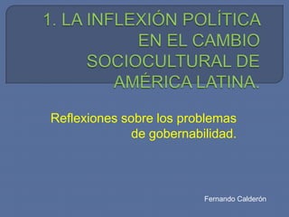 Este documento discute los problemas actuales de la educación en México. En particular, analiza las crisis políticas y sociales en América Latina debido a cambios socioculturales y de globalización. Identifica problemas político-institucionales como límites en la representación, demandas de participación ciudadana y pluralismo cultural. También señala problemas de pobreza e inequidad como desempleo. El documento argumenta que para mejorar la gobernabilidad democrática se deben abordar tanto los problemas políticos como los sociales y de equidad.