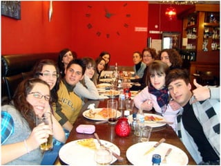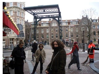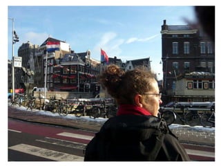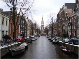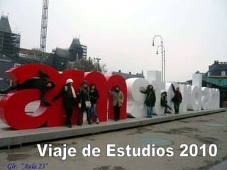 El documento resume un viaje de estudios a Amsterdam realizado por un grupo de estudiantes en 2010. Incluye visitas a museos como el Rijks Museum, el Van Gogh Museum y el Allard Pierson Museum, así como paseos por el barrio rojo y canales de la ciudad. El grupo disfrutó de la mayoría de edad de una compañera, a pesar de enfrentar el frío clima, y celebró un cumpleaños aunque faltaba el festejado.