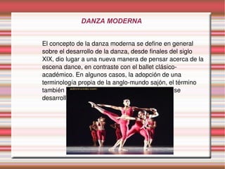 La danza moderna se define como un estilo de danza que surgió a finales del siglo XIX en contraposición al ballet clásico, adoptando nuevas técnicas corporales y estilos personales. En los años 30 en Estados Unidos, la danza moderna se desarrolló notablemente en Nueva York, distinguiéndose por la creación de técnicas individuales. Algunos de los estilos que comprenden la danza moderna son el flamenco, el tango, la salsa y el hip-hop.