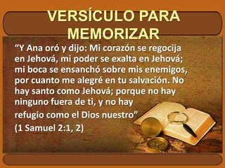 Este documento presenta la historia bíblica de Ana, una mujer que no podía tener hijos y sufría maltrato por parte de su marido y su rival. A través de la oración ferviente, Ana le prometió a Dios que si le daba un hijo, lo dedicaría a Dios. Dios escuchó la oración de Ana y le concedió un hijo, a quien llamó Samuel. Verdadera a su promesa, Ana entregó a Samuel al servicio del Señor. A través de esta historia, el documento enseña que aunque hay