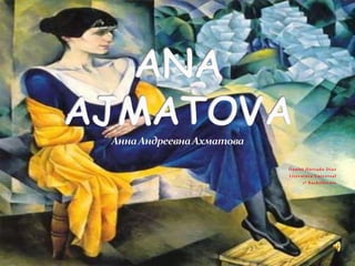 Este documento presenta una introducción a la poeta rusa Anna Ajmátova. Resume las etapas clave de su vida y obra poética, incluyendo su nacimiento en 1890, su adopción del apellido Ajmátova, y su pertenencia al movimiento acmeista. Describe brevemente las circunstancias trágicas que vivieron muchos poetas rusos del siglo XX como Mandelstan y Maiakovsky. Explica las principales etapas de la literatura rusa, desde la Edad de Oro hasta la Edad de Plata y los