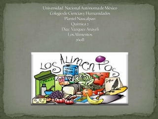 El documento describe los principales tipos de alimentos y nutrientes necesarios para el cuerpo humano. Explica que las proteínas están formadas por cadenas de aminoácidos, las vitaminas son compuestos necesarios para el funcionamiento fisiológico, y los lípidos o grasas están compuestos de carbono e hidrógeno. Además, los carbohidratos son los compuestos orgánicos más abundantes e incluyen el carbono, hidrógeno y oxígeno, y los micronutrientes como vitaminas y minerales son necesarios en peque