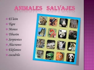 Los animales salvajes mencionados incluyen leones, tigres, monos, tiburones, serpientes, alacranes, elefantes y cocodrilos. Los animales salvajes no han sido domesticados y viven en hábitats naturales como selvas y sabanas. El león, conocido como el rey de la selva, puede medir hasta 3.3 metros y pesar 270 kg. Los cocodrilos son reptiles acuáticos que han existido por 200 millones de años y viven en áreas tropicales y subtropicales. Los delfines son mamífer