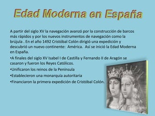 En el siglo XV, la navegación avanzó con barcos más rápidos y la brújula. En 1492, Cristóbal Colón dirigió una expedición que descubrió América, iniciando la Edad Moderna en España. Los Reyes Católicos financiaron la expedición de Colón y unificaron los reinos de la Península Ibérica.