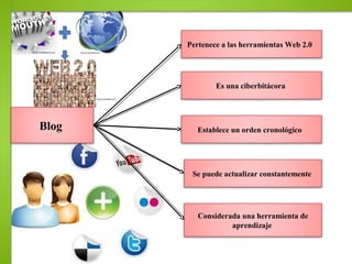 El documento describe los blogs como herramientas web 2.0 que permiten publicar contenidos de forma cronológica y actualizarlos constantemente. Explica que los blogs pueden ser educativos, corporativos o personales y servir para compartir conocimientos, ideas o fines publicitarios. Finalmente, destaca que los blogs son útiles como herramientas educativas para la comunicación, el aprendizaje y el intercambio de ideas entre la comunidad educativa.