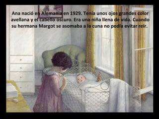 Ana Frank nació en Alemania en 1929 pero su familia huyó a los Países Bajos para escapar de la persecución nazi de los judíos. En 1942, la familia Frank y otros cuatro judíos se escondieron en un anexo secreto en Ámsterdam para evitar ser deportados a campos de concentración. Ana documentó su vida diaria escondida en un diario. En 1944, el grupo fue descubierto y deportado; solo el padre de Ana sobrevivió. El diario de Ana se publicó después de la guerra y se convirtió en un testim