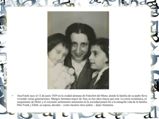 Ana Frank nació en Alemania en 1929 pero su familia judía huyó de los nazis a los Países Bajos en 1933. En 1942, la familia Frank y otros cuatro judíos se escondieron en la parte trasera de un edificio en Ámsterdam para escapar de la deportación. Ana escribió un diario mientras estuvo escondida describiendo la vida diaria y sus pensamientos. Fueron descubiertos en 1944, arrestados, y enviados a campos de concentración, donde la mayoría murieron, incluyendo Ana en 1945.