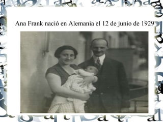 Ana Frank nació en Alemania en 1929 y huyó con su familia a Holanda para escapar de los nazis. Vivieron escondidos durante dos años detrás de la fábrica de su padre hasta que fueron descubiertos y arrestados. Todos los escondidos murieron en campos de concentración excepto el padre de Ana, Otto Frank, quien publicó el diario íntimo de Ana después de la guerra para compartir su historia.