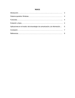 Windows es el sistema operativo más utilizado a nivel mundial. Ha evolucionado desde 1985 con versiones como Windows 1, Windows 95, Windows XP, Windows 7 y Windows 10, mejorando la interfaz gráfica y agregando nuevas funciones. Windows permite el uso de aplicaciones como Internet Explorer, Microsoft Office y juegos. Es fundamental para la tecnología de comunicación e información al facilitar el acceso y compartir de contenidos.
