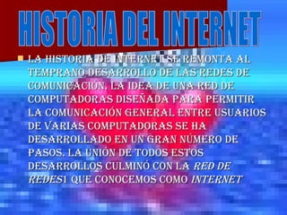 El documento describe la historia del desarrollo de Internet desde las primeras redes de computadoras en los años 1960 hasta la adopción global de TCP/IP en la década de 1980. Algunos hitos clave incluyen el desarrollo de la conmutación de paquetes, la creación de ARPANET en 1969, el establecimiento de estándares como TCP/IP y la expansión de redes académicas y comerciales a nivel mundial.