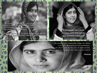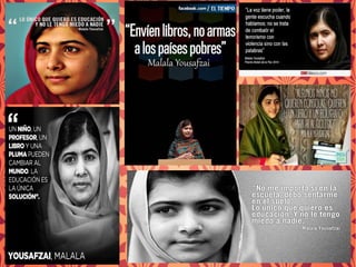 Malala Yousafzai nació en Pakistán y se hizo famosa por su blog en el que narraba su vida bajo el régimen talibán y su lucha por el derecho a la educación de las niñas. Fue víctima de un atentado por parte de los talibanes en 2012 por su activismo, pero sobrevivió y continuó su labor. En 2014 se convirtió en la ganadora más joven del Premio Nobel de la Paz por su lucha contra la opresión infantil y a favor del derecho de todos los niños a la educación.