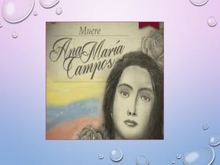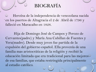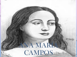 Ana María Campos fue una heroína de la independencia venezolana. Nació en 1796 y murió en 1828. Recibió una educación limitada debido a su género, pero estuvo expuesta a ideas liberales. Lideró la resistencia contra la contrarrevolución realista en 1821-1823, siendo torturada. Participó en la Batalla de Maracaibo de 1823, donde los revolucionarios obtuvieron la victoria. Murió cinco años después a causa de las heridas de tortura.