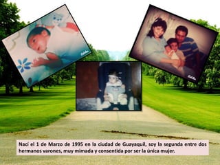 El documento es una autobiografía que narra la vida de una mujer nacida en Guayaquil en 1995, destacando su infancia feliz, la influencia de su familia y su amor por la educación. Se menciona su esposo, Andrés, y la llegada de su hijo Elías, así como su gratitud hacia sus amigos y el apoyo en su vida familiar. Además, se habla de 'Sweet Colors', una microempresa de decoración de eventos fundada por su amiga Adriana.