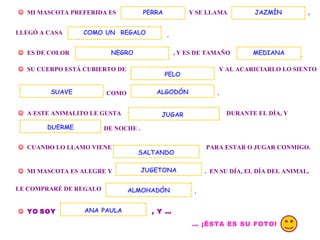 Ana Paula habla sobre su mascota preferida, una perra de color negro llamada Jazmín. Jazmín llegó a su casa como regalo y es de tamaño mediano, con un pelaje suave como el algodón. Le gusta jugar durante el día y dormir de noche, y siempre viene cuando Ana la llama. Jazmín es una mascota alegre y juguetona.