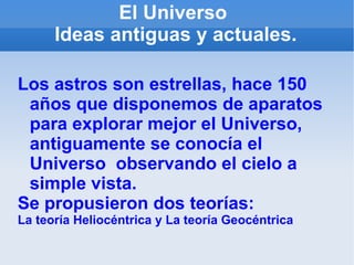 El documento resume el conocimiento histórico del Universo desde las primeras teorías geocéntrica y heliocéntrica hasta los descubrimientos modernos realizados mediante telescopios y sondas espaciales. Explica la formación y componentes del Sistema Solar, incluyendo los planetas interiores y exteriores, cuerpos menores como asteroides y cometas, y unidades de medida astronómicas. También describe brevemente las galaxias, nebulosas y la teoría del Big Bang sobre el origen del Universo