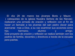 Los catequistas Boris y Mauro organizaron una jornada de oración y reflexión el 29 de marzo para acercar a los jóvenes de la iglesia Nuestra Señora de las Nieves más a Dios y examinar sus acciones como hijos, hermanos, alumnos y amigos. Este proyecto de oración y reflexión también incluye a los padres, docentes y directivos a través de la escuela para padres.
