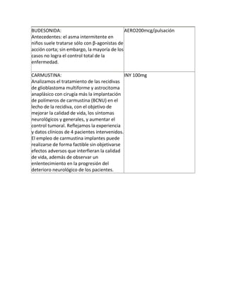 El documento habla sobre el tratamiento del asma intermitente en niños con budesonida y el tratamiento de recidivas de glioblastoma multiforme y astrocitoma anaplásico con cirugía e implantes de polímeros de carmustina. El tratamiento con sólo β-agonistas de acción corta a menudo no controla completamente el asma en niños, mientras que la cirugía más implantes de carmustina ha mejorado la calidad de vida y control tumoral sin efectos adversos en 4 pacientes con cáncer cerebral.