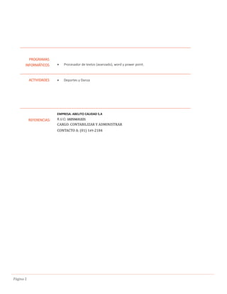 Este documento presenta el resumen curricular de Anako U.081, especialista en comercio exterior con experiencia administrando productos comestibles. Estudió administración de negocios internacionales y secundaria en el Colegio Augusto B. Leguía. Sabe usar paquetes informáticos como Word y PowerPoint de manera avanzada.
