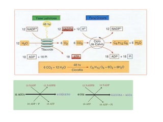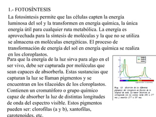 La fotosíntesis permite a las plantas y algas convertir la energía solar en energía química mediante la captura de CO2 y la liberación de O2. Esto ocurre en dos fases: la fase lumínica, donde se producen ATP y NADPH en los cloroplastos, y la fase oscura, donde se usa esta energía para fijar el CO2 en compuestos orgánicos como la glucosa. Otros procesos anabólicos incluyen la gluconeogénesis, la síntesis de lípidos y la reducción de