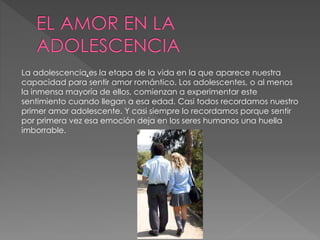 El documento describe cómo la adolescencia es la etapa en la que las personas desarrollan la capacidad de sentir amor romántico. Durante la adolescencia, la mayoría de las personas experimentan su primer amor y desamor, los cuales dejan una huella imborrable debido a que los adolescentes viven las emociones de forma muy intensa, influenciados por los cambios biológicos y psicológicos propios de esa edad. Además, el documento explica que la sexualidad es un aspecto central y complejo del ser humano que abarca más que solo las