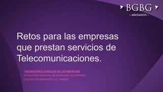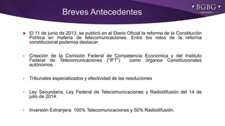 El documento describe los principales retos regulatorios y de cumplimiento que enfrentan las empresas de telecomunicaciones en México. Brevemente resume la reforma constitucional de 2013 que creó la Comisión Federal de Competencia Económica y el Instituto Federal de Telecomunicaciones como órganos autónomos. Explica los diferentes tipos de licencias para prestar servicios, sus requisitos y obligaciones regulatorias. Finalmente, destaca los retos en materia de protección al consumidor y protección de datos personales.