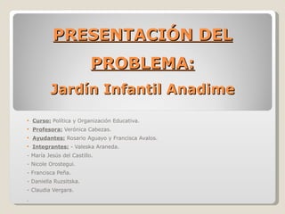 El documento presenta el caso del jardín infantil "Anadime" que tiene un 15% de niños con necesidades educativas especiales. El problema principal es que la JUNAEB no permite el ingreso de alimentos especiales que necesitan algunos niños. El objetivo es evaluar el nivel de inclusión del jardín y proponer mejoras considerando su proyecto educativo e incluyendo a todos los niños sin discriminación.