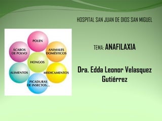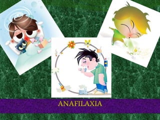 El documento habla sobre la anafilaxia, una reacción alérgica potencialmente mortal que ocurre rápidamente después de la exposición a un alérgeno. Describe los síntomas, causas comunes como medicamentos e insectos, el tratamiento con epinefrina y otros medicamentos, y la importancia de prevenir las reacciones mediante la detección de alérgenos y la evitación de los mismos.