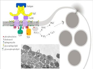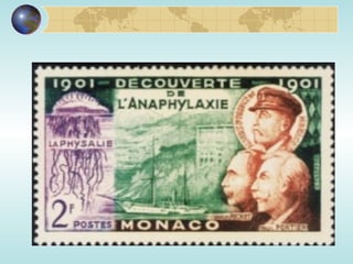 El documento proporciona información sobre la anafilaxia. Define la anafilaxia como una reacción inmunológica sistémica mediada por IgE específica a un alergeno. Describe los mecanismos inmunológicos, los desencadenantes comunes como alimentos y medicamentos, los síntomas clínicos y el tratamiento con énfasis en el uso temprano de epinefrina.