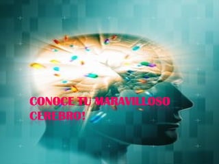 El documento describe las características y funciones del cerebro humano. Explica que el cerebro pesa menos de 3 libras pero es miles de veces más poderoso que cualquier computadora. Contiene alrededor de 100 mil millones de neuronas que forman conexiones llamadas sinapsis a una velocidad de 3 mil millones por segundo. También describe las diferentes partes y funciones del cerebro, los tipos de inteligencia, y cómo el cerebro almacena y procesa información.