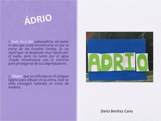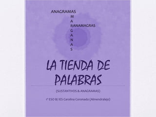 El documento presenta una lista de anagramas y sus definiciones. Los anagramas son palabras formadas al reordenar las letras de otras palabras. Se definen sustantivos y sentimientos. Algunos ejemplos son "ádrios" que define un animal volador de tres patas con pelo pegajoso y "laciu" que define una persona experta en videojuegos.