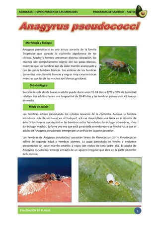 Anagyrus pseudococci es una avispa parasita que se usa para controlar plagas de cochinilla. Tiene un ciclo de vida de 15-18 días y las hembras ponen alrededor de 45 huevos. Las hembras parasitan las larvas de la cochinilla, introduciendo un huevo. La larva parasitada se endurece y hincha hasta que emerge el adulto de Anagyrus pseudococci.