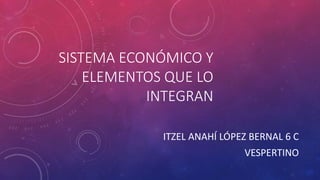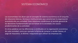 El documento describe los elementos que integran un sistema económico. Estos elementos incluyen las necesidades, bienes y servicios; los problemas centrales de la economía; las actividades económicas; los factores productivos como la tierra, el trabajo y el capital; los agentes económicos; y los tres sectores económicos principales: agropecuario, industrial y de servicios.