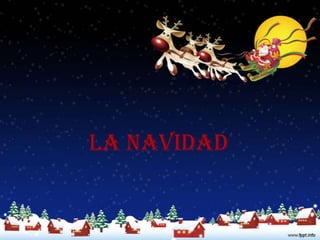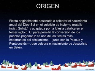 La Navidad celebra el nacimiento de Jesucristo el 25 de diciembre y originalmente conmemoraba el solsticio de invierno. Se celebra con tradiciones como la cena de Navidad, villancicos, posadas y piñatas. Personajes como Santa Claus traen regalos a los niños.