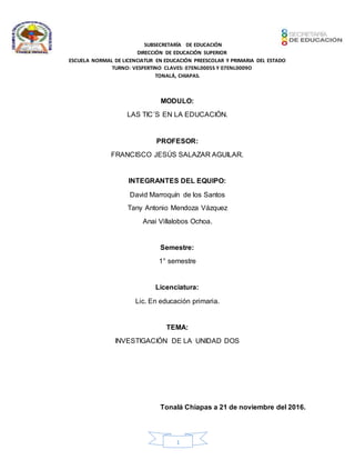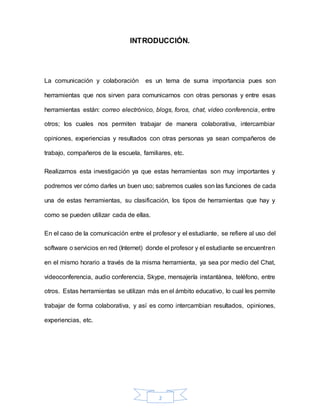 El documento presenta una investigación sobre el uso de las TIC en la educación, enfatizando la importancia de la comunicación y colaboración en entornos educativos. Se abordan los componentes de hardware y software, así como herramientas de comunicación en línea, clasificándolas en sincrónicas y asincrónicas. Además, se discute el papel de los procesadores de texto y los recursos de la web 2.0 en la mejora de la comunicación y colaboración entre estudiantes y profesores.