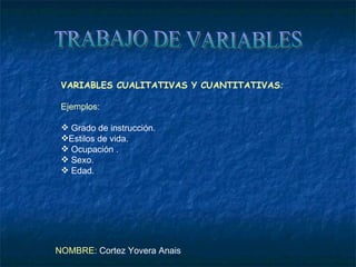 Este documento describe diferentes tipos de variables que pueden usarse en trabajos estadísticos. Explica variables cualitativas y cuantitativas, así como variables nominales, ordinales y de escala. Proporciona ejemplos de cada tipo de variable como exámenes médicos, niveles de presión arterial y glucosa, y el número de atenciones médicas.