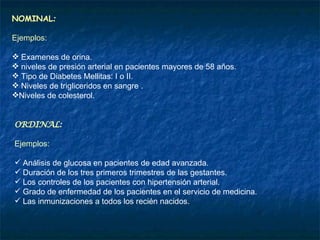 Este documento describe diferentes tipos de variables que pueden usarse en trabajos estadísticos. Explica variables cualitativas y cuantitativas, así como variables nominales, ordinales y de escala. Proporciona ejemplos de cada tipo de variable como grado de instrucción, sexo, exámenes de orina, análisis de glucosa, número de atenciones hospitalarias, y mediciones como presión arterial y glucosa en sangre.