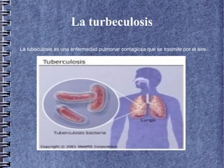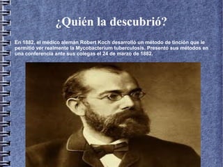 La tuberculosis es una enfermedad pulmonar contagiosa causada por la bacteria Mycobacterium tuberculosis, que se transmite por el aire cuando personas enfermas tosen, estornudan o hablan. En 1882, el médico alemán Robert Koch desarrolló un método para visualizar la bacteria que causa la tuberculosis y presentó sus hallazgos. Si no se trata, una persona con tuberculosis puede transmitir la enfermedad a entre 10 y 15 personas por año a través del aire, aunque no todas las personas infectadas enferman ya que el sistema inmunitario a veces puede matar