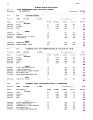 Este documento presenta un presupuesto para la implementación de una agencia CMAC en Santa-Huancayo. Incluye el análisis de precios unitarios de varias partidas relacionadas con la arquitectura como la construcción de muros de ladrillo, tarrajes, tabiquería de drywall y falsos techos de yeso. Se detallan los costos de mano de obra, materiales y equipos requeridos para cada actividad.