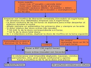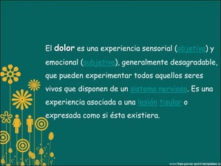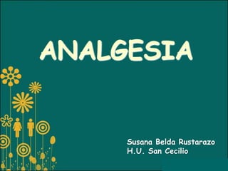 Este documento describe la analgesia y los diferentes tipos de dolor, incluyendo somático, neuropático y visceral. Explica los diferentes tratamientos para el dolor, incluyendo analgésicos, antiinflamatorios y opioides. Detalla los diferentes tipos de opioides como agonistas puros, agonistas parciales y antagonistas, así como ejemplos específicos y sus usos.