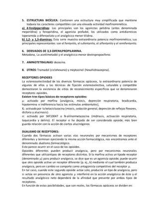 1. Los analgésicos opioides se caracterizan por su afinidad por los receptores opioides, causando analgesia intensa a través del SNC. 2. La morfina es el representante principal y se obtiene del opio, causando efectos como analgesia, depresión respiratoria y miosis. 3. Existen diferentes tipos de receptores opioides como μ, κ y σ que son activados por distintos opioides, pudiendo causar analgesia a través de mecanismos diferentes.
