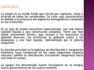 Este documento describe los componentes principales de la sangre. En pocas oraciones: La sangre está compuesta de plasma sanguíneo y elementos figurados como eritrocitos, leucocitos y plaquetas. Los eritrocitos transportan oxígeno y dióxido de carbono usando la hemoglobina, mientras que los leucocitos ayudan a combatir infecciones y los plaquetas ayudan a la coagulación de la sangre. El plasma sanguíneo es el fluido en el que están suspendidos estos componentes y transporta nutrientes, hormonas y desech