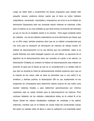 El documento resume varios métodos matemáticos importantes como la eliminación Gaussiana, el método de Gauss, la descomposición LU, la factorización de Cholesky, la descomposición QR, y los métodos de Gauss-Seidel y Jacobi. Explica que estos métodos son útiles para resolver sistemas de ecuaciones lineales y descomponer matrices.