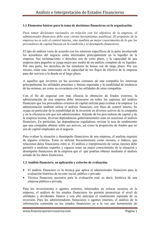 Este documento describe los elementos básicos del análisis financiero y su aplicación para la toma de decisiones. Explica que el análisis financiero involucra el cálculo de razones que comparan datos financieros para evaluar la situación y desempeño de una empresa. También describe los métodos de análisis vertical, horizontal y la comparación de razones a través del tiempo y entre empresas para identificar tendencias y realizar evaluaciones. El objetivo general es que la interpretación de múltiples razones financieras permita a los analistas comprender mejor la posición y