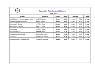 El documento presenta el plan de estudios de tres años de la carrera de Análisis Clínicos, con las materias correspondientes a cada año, los profesores a cargo, las fechas y horarios de consulta y cierre de inscripción. Se detallan 11 materias para el primer año, 10 materias para el segundo año y 3 materias para el tercer año, con la información relevante para cada una.