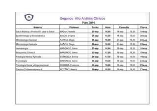 Este documento presenta los planes de estudio para los tres años de la carrera de Análisis Clínicos, incluyendo las asignaturas, profesores, fechas y horarios de consulta y cierre para cada materia.