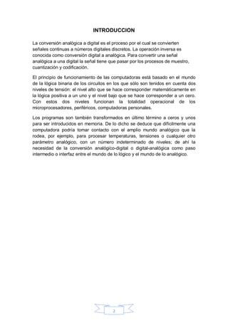 Este documento explica el proceso de conversión de señales analógicas a digitales y viceversa. La conversión analógico a digital implica muestreo, cuantización y codificación de la señal, mientras que la conversión digital a analógica usa un convertidor digital-analógico. Las ventajas de las señales digitales incluyen mayor facilidad de almacenamiento, transmisión y detección de errores, mientras que las desventajas son el mayor ancho de banda requerido y la necesidad de sincronización prec