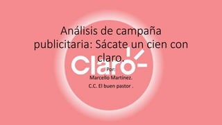 La campaña publicitaria "Sácate un cien con claro" promueve los planes de datos triple de la compañía Claro, apuntando a jóvenes con smartphones. Ofrece la oportunidad de ganar una tableta Huawei o computadora Acer al contratar el servicio. El anuncio usa un tono gracioso para promover los beneficios de más datos a un precio accesible de una manera entretenida y motivadora.