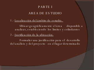 El documento presenta las secciones de un análisis urbano ambiental que incluye el estudio del área de ubicación, la recopilación de información sobre el medio físico natural, social y urbano edilicio, un análisis FODA, y propone una síntesis, conclusiones, misión, visión y premisas para desarrollar una propuesta teórica.