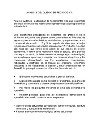 Este documento describe una experiencia pedagógica en la que se enseñó a estudiantes de octavo grado a usar PowerPoint. El docente explicó paso a paso cómo crear presentaciones en PowerPoint y luego los estudiantes practicaron trabajando en parejas para demostrar lo que habían aprendido. El objetivo era que los estudiantes desarrollaran habilidades tecnológicas y aprendieran a organizar información utilizando herramientas digitales.