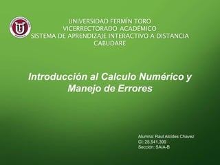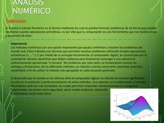 Este documento presenta una introducción al cálculo numérico y el manejo de errores. Explica que el análisis numérico involucra formular problemas matemáticos de manera que se puedan resolver mediante operaciones aritméticas simples con la ayuda de una computadora. También describe los métodos numéricos, los números de máquina, los errores absolutos y relativos, y las fuentes básicas de errores como el redondeo y el truncamiento. Finalmente, define la estabilidad, inestabilidad, condicionamiento y números de condic